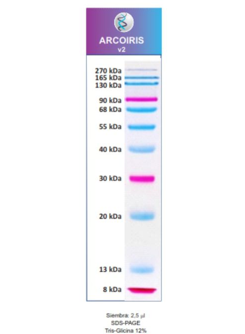 El marcador de peso molecular Arcoiris v2 está compuesto por 11 proteínas recombinantes de alta pureza, preteñidas. El rango de peso molecular observable en gel de Tris-Glicina es de 8 a 270 kDa (~8, ~13, ~20, 30, ~40, ~55, ~68, ~90, ~130, ~165, ~270 kDa). Entre estas, las bandas de proteínas de 90 kDa, 30 kDa y 8 kDa son de color rojo rosado, mientras que las demás son de color azul, lo que facilita la observación dinámica del estado de la electroforesis de proteínas o la evaluación del efecto de transferencia de proteínas. Es adecuado como estándar de peso molecular de proteínas para SDS-PAGE y Western blot.